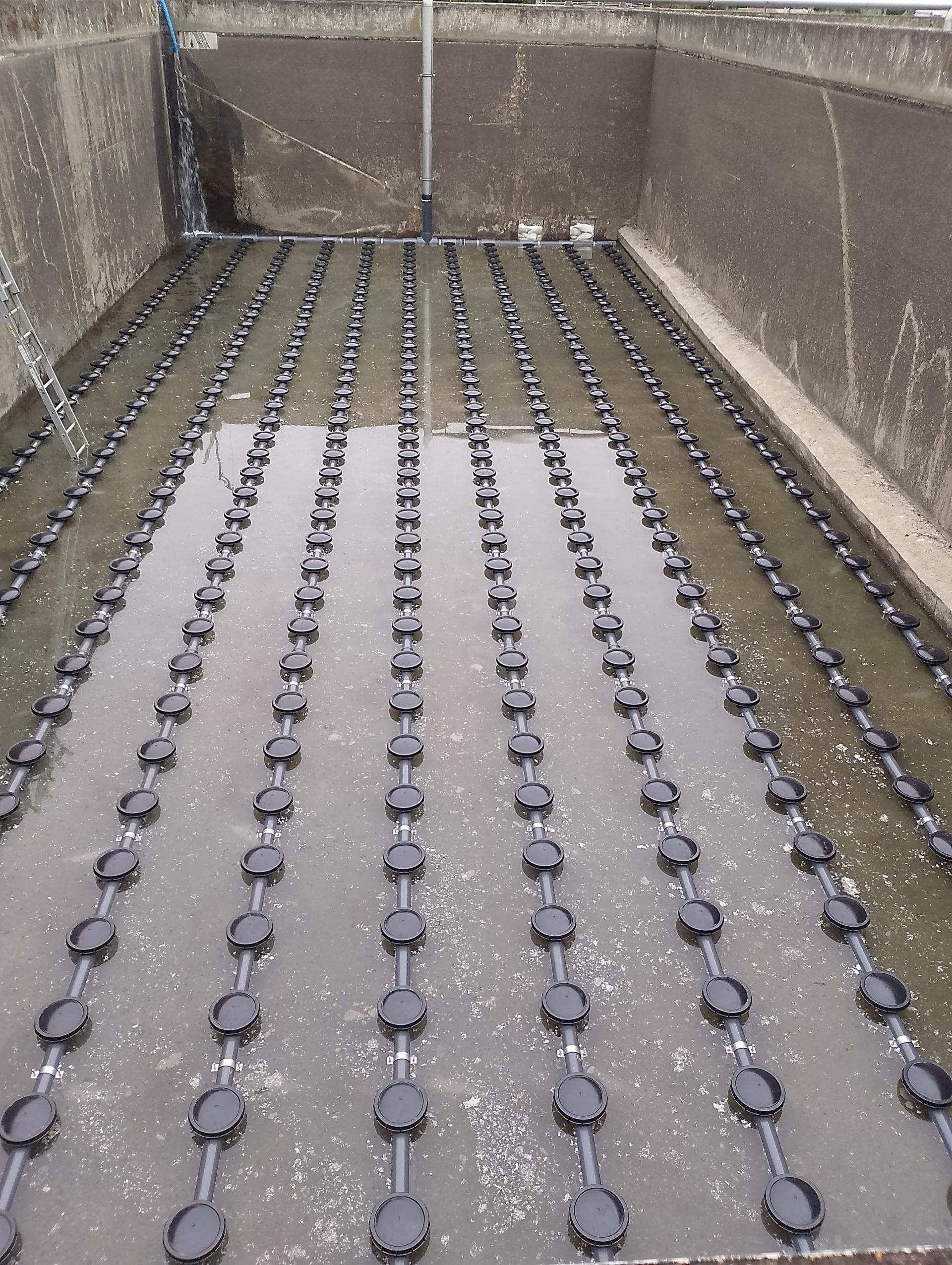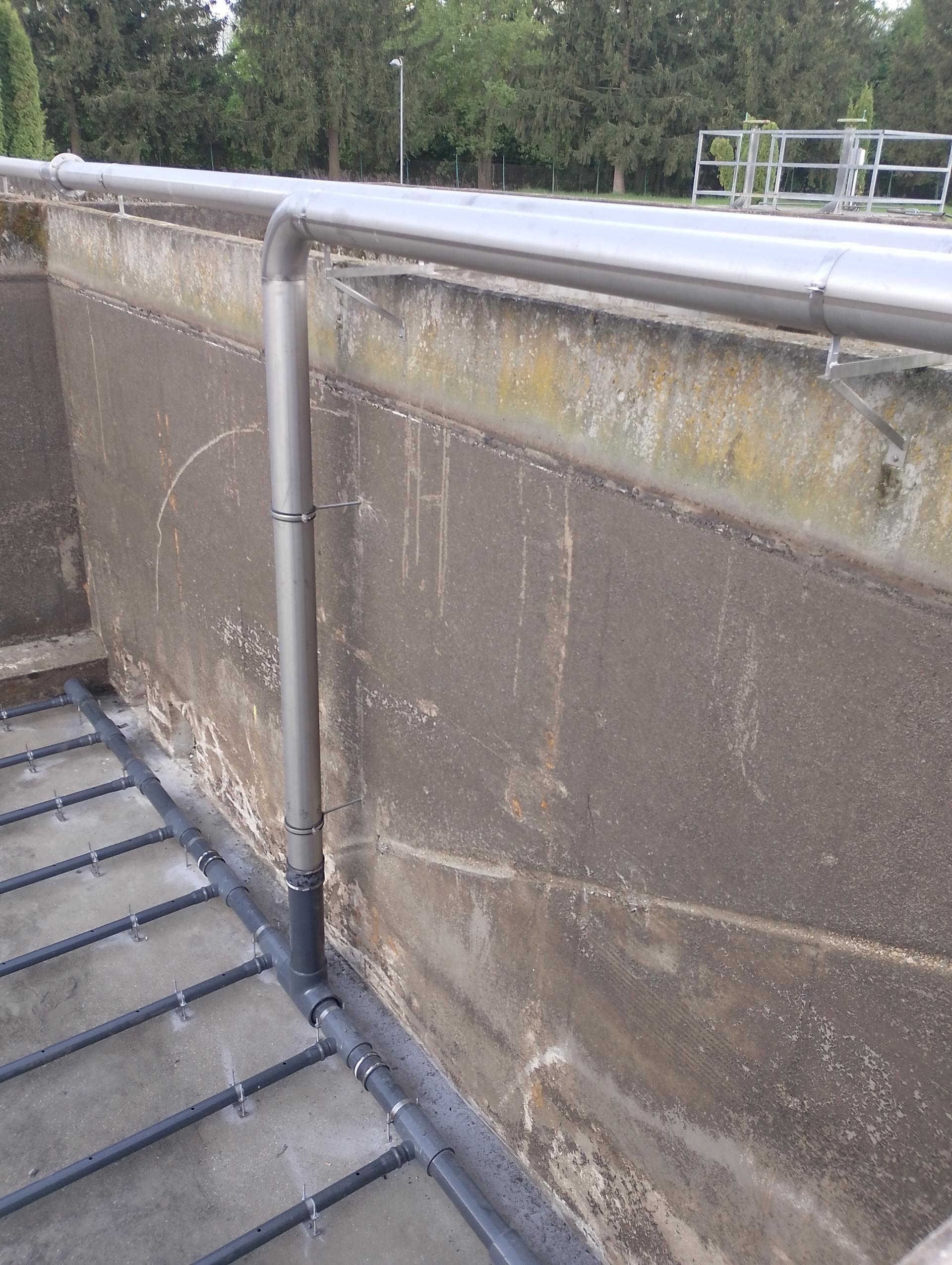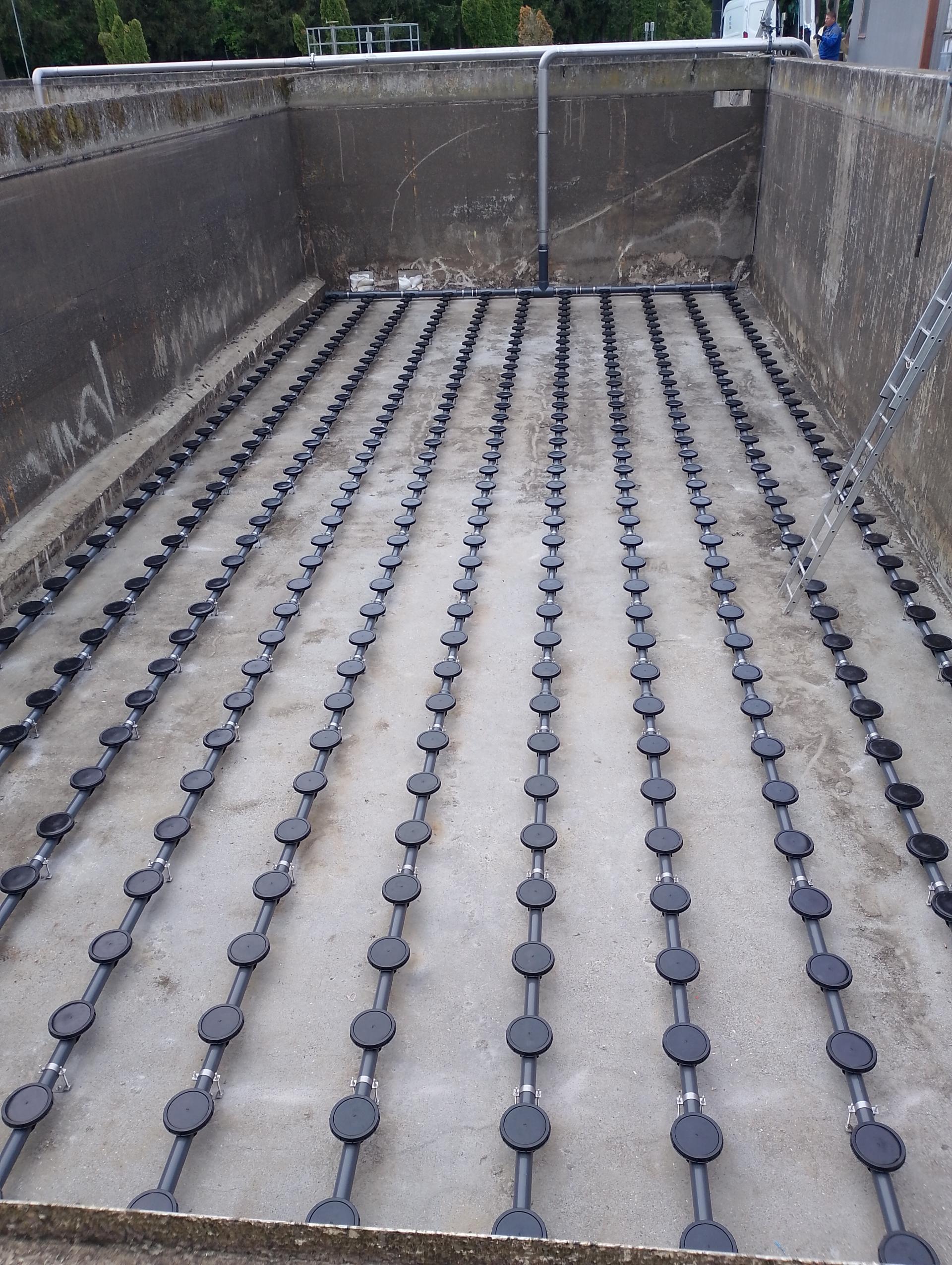A munkához tartozott továbbá a leszálló légvezetékek cseréje is, amelyet a rendszer növekvő kapacitása miatt a szükséges méretűre növeltünk. A levegőcsövek csatlakoztatása után felszereltük az új 9”-os tányérdiffúzorokat a teljes rendszeren. A levegőztető rendszer összeszerelése után következett a vizes próba, mely során ellenőriztük az új rendszer buborékképét, valamint az esetleges szivárgásokat. Miután mindent megfelelőnek találtunk, a rendszert készre jelentettük.