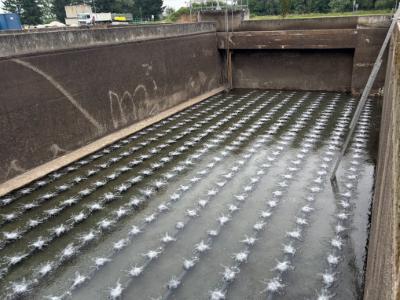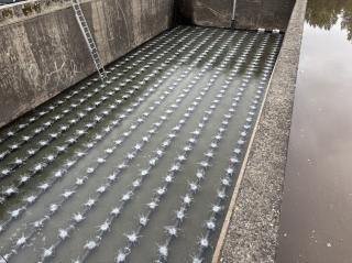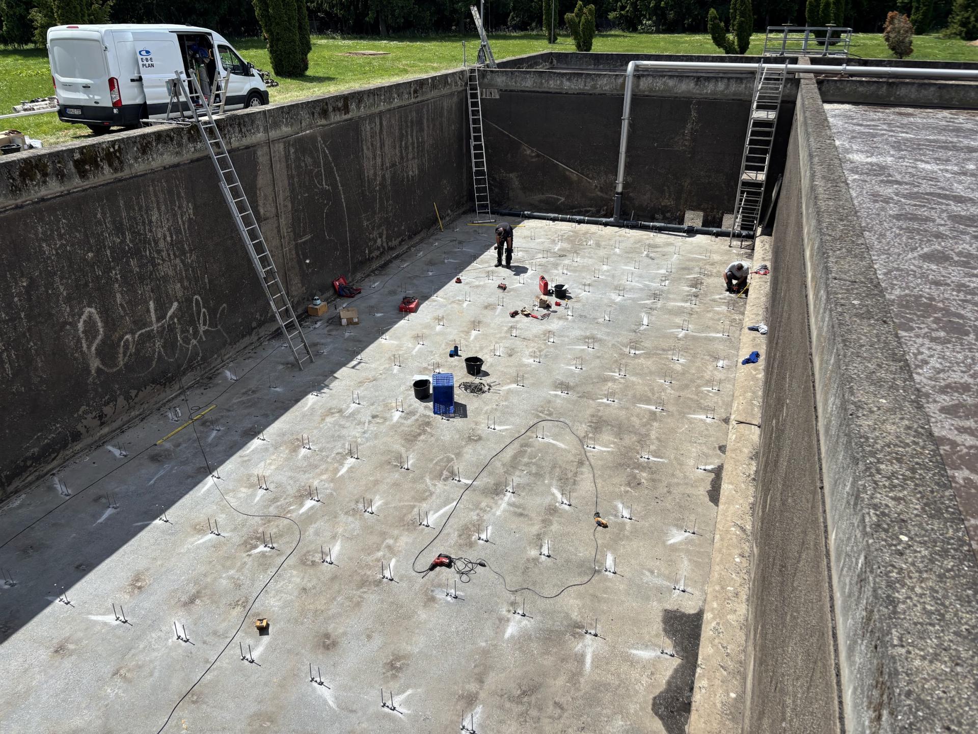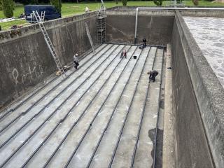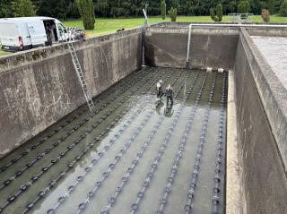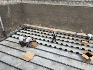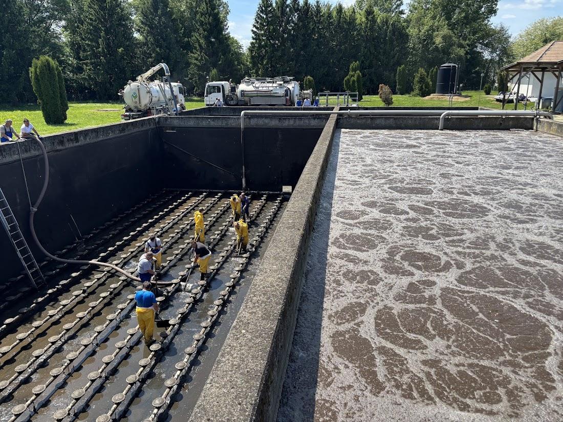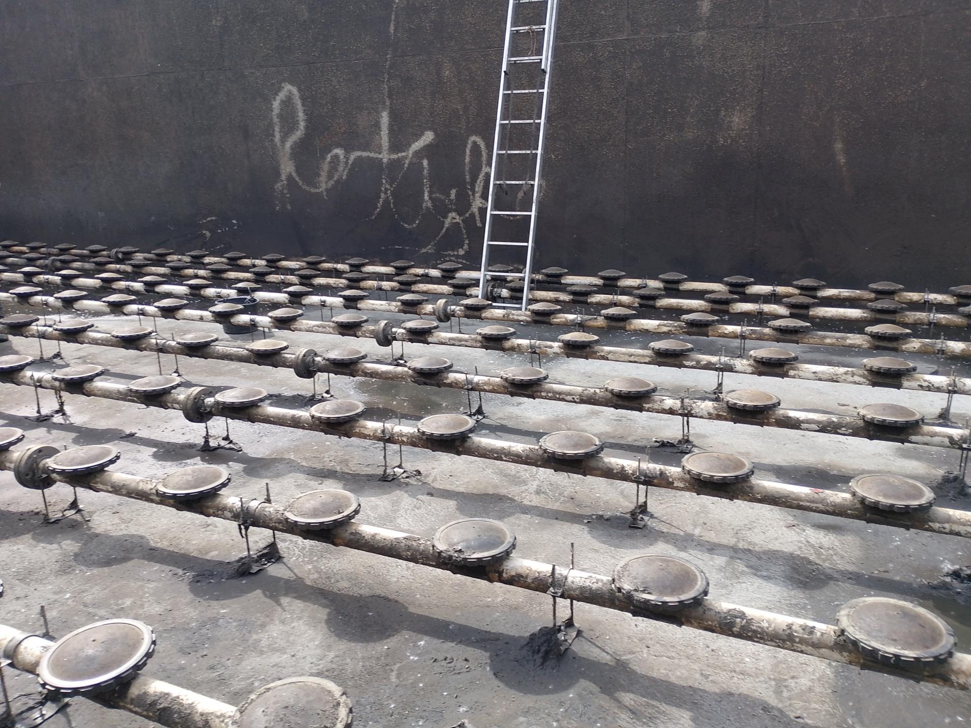 A munkához tartozott továbbá a leszálló légvezetékek cseréje is, amelyet a rendszer növekvő kapacitása miatt a szükséges méretűre növeltünk. A levegőcsövek csatlakoztatása után felszereltük az új 9”-os tányérdiffúzorokat a teljes rendszeren. A levegőztető rendszer összeszerelése után következett a vizes próba, mely során ellenőriztük az új rendszer buborékképét, valamint az esetleges szivárgásokat. Miután mindent megfelelőnek találtunk, a rendszert készre jelentettük.