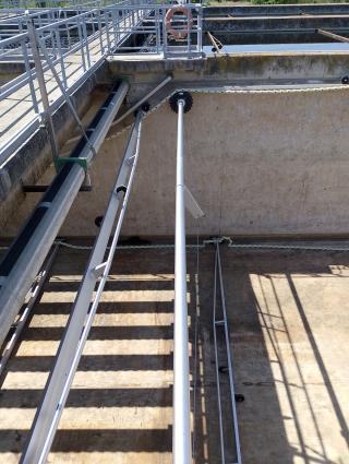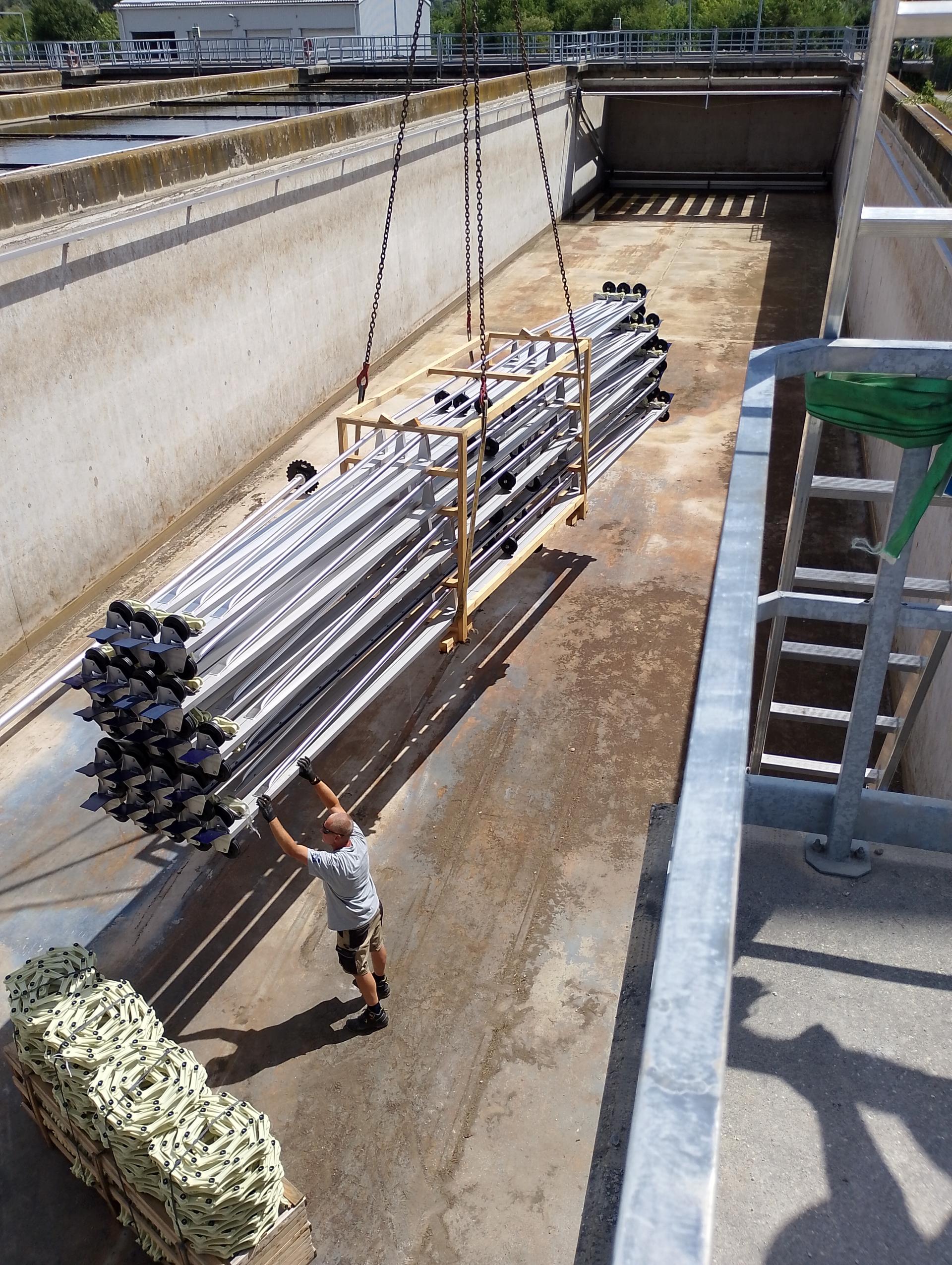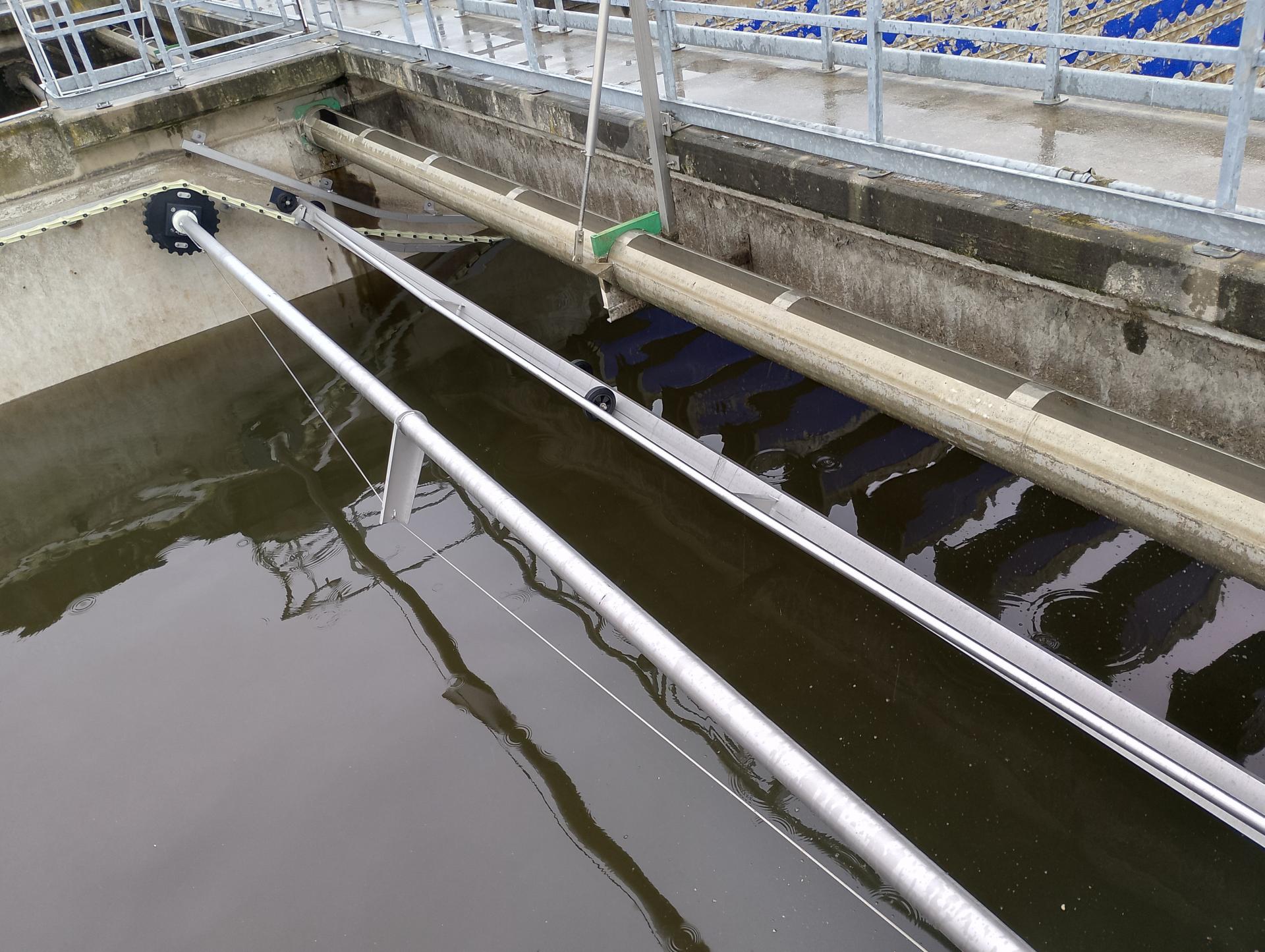 2025 évben két kotró cseréjét végeztük az utóülepítő medencékben. A meglévő - sok szerkezeti és korróziós problémákkal üzemelő – Dewa kotrókat cseréltük le az osztrák gyártmányú, modern, megbízható Tschuda KKR típusú kotró berendezésekre. A projekt a régi kotró leszerelésével és helyszíni deponálásával indult, majd ezt követően a medencében a szintezést és a tengelyek kijelölését végeztük. A tengelyek, tartók illetve a hajtómű beszerelése után a megvezető sínek felhelyezése következett. Végül a műanyag hajtó- és vontatóláncok, valamint az erősített kialakítású kotrólapátok felrögzítésével állt össze a berendezés.